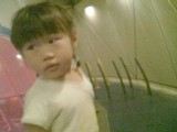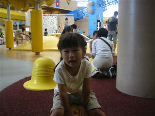 センター内は、真ん中にでっかい遊具(公園にある遊具の巨大版)があって、中は迷路のようなトンネルになってます。トンネルの途中には、至るところに仕掛けがあるのですが、sachiは(ぜんぜん怖くないのに)"コワイ""コワイ"と言いながらヘッピリ腰。(>_<)頂上付近で、床から生えてる(?)ニョロニョロ(みたいなやつ)がとくに怖いようで、とうとう前に進めなくなってしまいました(+o+)