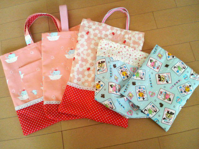 さっちゃんが幼稚園に持っていく手さげカバンが一通りでき上がりました!かわいいのが、たくさんできたね!さっちゃん幼稚園で自慢してね!(^^)!