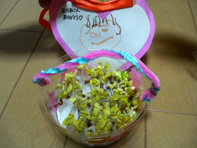 sachiが母の日に、ママの似顔絵とかいわれ大根の種をプレゼントしてくれました。もう芽が出てま〜す。ちゃんと成長するかな。(^^♪