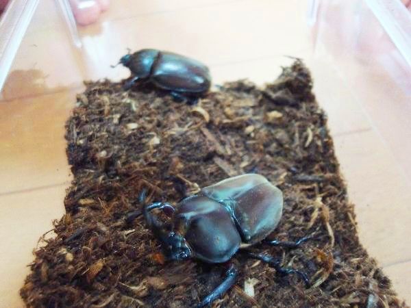 みどり電化でもらったカブト虫が成虫になりました。1匹ずつもらいましたが、オスメスになっていました♪(偶然!?)エサと登り木を買ってくると、早速、エサにかぶりつき!!その後もずっとエサから離れません、よっぽど空腹だったのか?? |