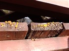 wooddeckの一部が腐って木材がふにゃふにゃになっていました!水分でブヨブヨになっているところに、何やら怪しいオレンジの物体が生えているのをママが見つけました!これは、大変!木材は交換しないと元通りになりません。梅雨が明けたら新しいのと交換しよう! |
