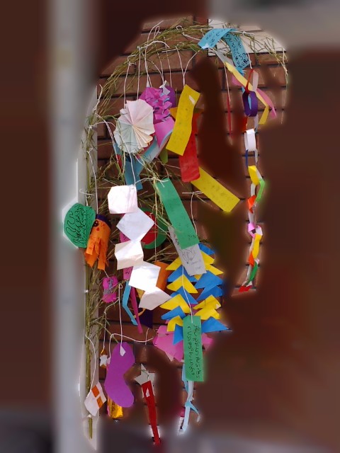 サチ☆カナの七夕の笹飾りです。今年は幼稚園からたくさん飾りをもらってきたので、今までの笹では小さすぎ(+_+)・・・大きい笹を買ってきましが真ん中でポキッ!!うまくくくりつけないと、真ん中で曲がってしまいます。短冊にもたくさん、お願いごとを書いていました〜〜お利口にしていれば願いも叶うはず! |