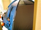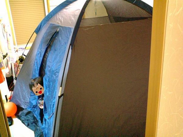 盆休みにキャンプに行こうと、思い切ってテントを買いました。早速、家の中で組み立ててみたら、6畳の部屋から少しはみ出してしまいました!サチ☆カナも喜んで、テントの中におもちゃを持って入って大変!まだタープとかランタンとか必要なので、出費が続きます。