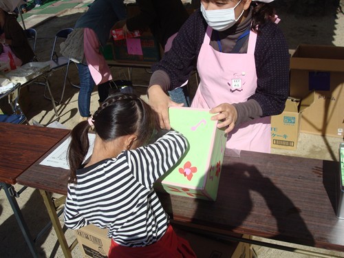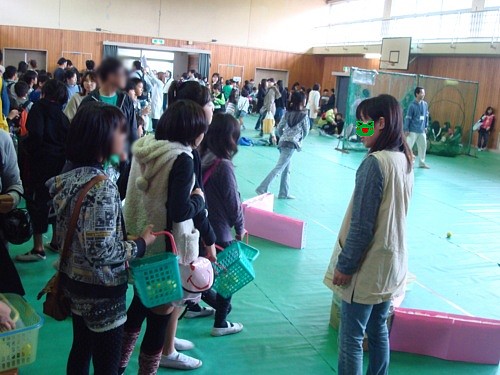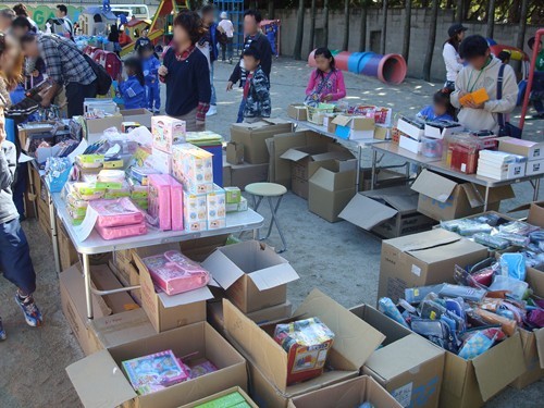 園内放送で、バザーがなんと9割引きのアナウンス!みんな殺到しています。もちろん、ママもこの中に・・・