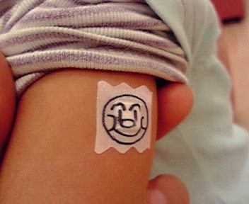 日本脳炎の予防接種(追加)があり、枚方市駅近くの病院まで行きました。いつも大泣きのさっちゃんですが、今回はカナと二人揃って期待通りの大大号泣!!しかも、よその子供は誰一人として泣いていなのに、情けないサチカナです(T_T) 注射後にはアンパンマンを貼ってもらいましたが、いつまで経っても注射嫌いは直りませんね。