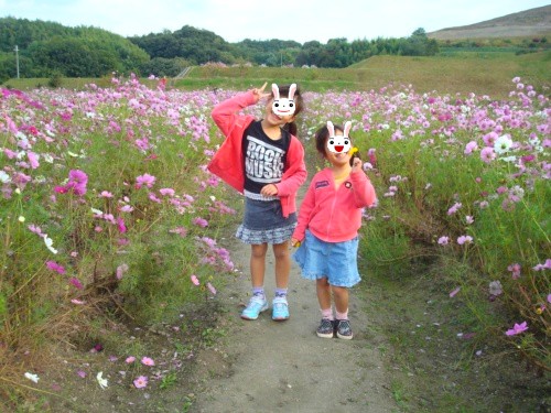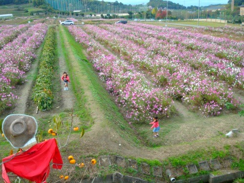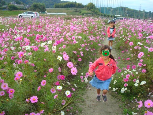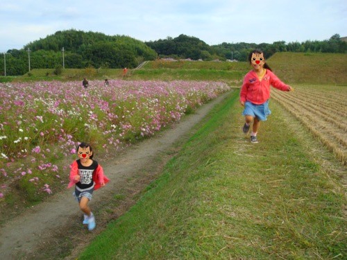 ということで、遊遊フェスタのあと、コスモス畑に行くことに!コスモスにあまり興味のないサチカナですが、畑を見ると、早速鬼ごっこの始まり・・・