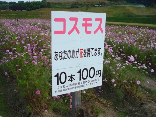 コスモスは10本100円也。柱にくくり付けた竹にお金を入れます!