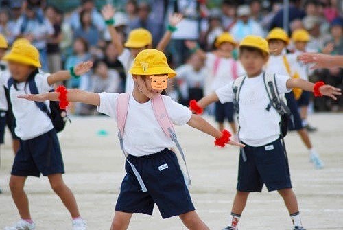 1年生の演技「学校に行こう!」。本当はランドセルなんでしょうが、替わりにリュックサックです。さっちゃんは間違えて“水筒”まで持って整列していました。途中で気付いて、演技直前に返しに来ていましたが・・・・相変わらず、そそっかしい!