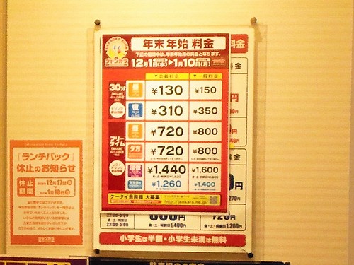 先週も来たのですが、1時間待ちだったのでやめました。でもどうしても歌いたいさっちゃんの希望で、今週は昼からカラオケにやってきましたが、料金の表示に何か貼ってあります。ゲっ、フリータイムの料金が2倍近くに跳ね上がっています!!ふつう正月料金は、年末年始だけじゃないの?と思うのですが、12/1から値上げするとは納得いきません。