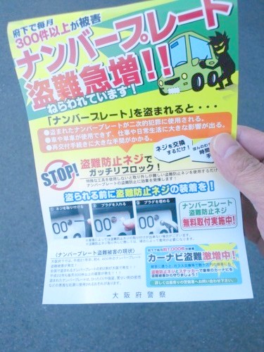 ぶらっとミドリ電化に行くと、黄緑のおじさんが待ちかまえていました。聞くと、ナンバープレート盗難防止用のボルトの無料取付を行っているとのこと。我が家も折角なので、取り付けてもらうことに!ナンバープレートは盗まれると、 殺人や強盗・誘拐など凶悪犯罪に使用する犯行車両への取付けなど,二次犯罪に悪用されるようです。警察の捜査の目をかいくぐり,発覚を遅らせるためなどに盗んだナンバープレートを取り付けた車両を悪用するそうです。