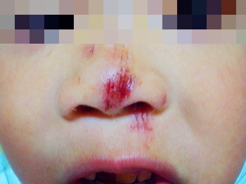 今日、幼稚園から連絡があり、カナちゃんがタイヤ飛びをしていて転けてしまった とのこと!!こけたときに顔を擦りむいたようで、とくに鼻がズルむけ状態!