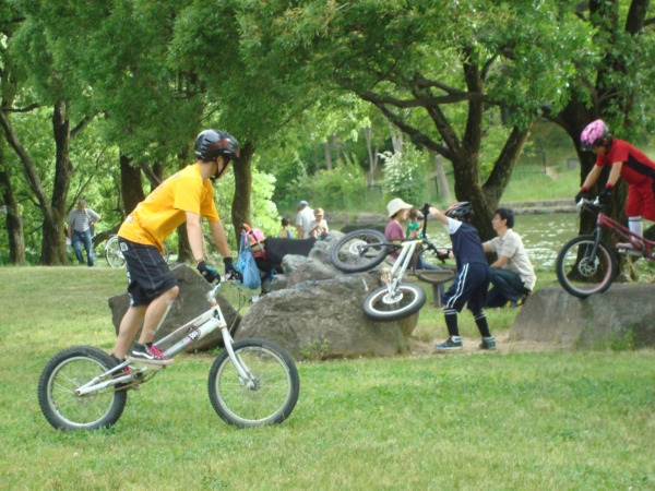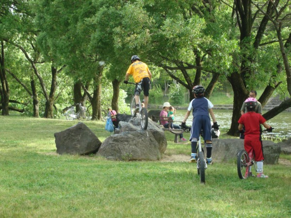 川遊びもほどほどに戻ってくると、BMX乗りの家族が子供が練習していました!