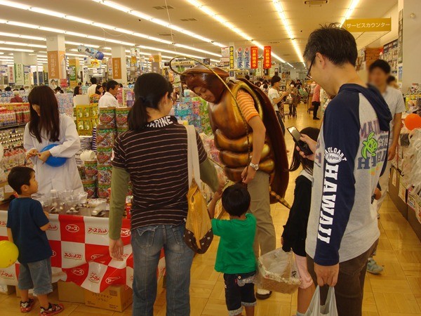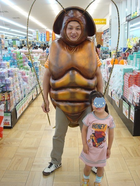 今日ムサシに行くと珍しく駐車場も渋滞。店内もお客で一杯で活気づいていました。しかししかし入口附近で、茶色の着ぐるみを発見!カナと遠目に見ていると、ゴキ○リに「一緒に写真を撮ろう!」と言われ、しぶしぶ2ショット。ゴキ○リの着ぐるみは、日本に1体しかないんやー!っとウソっぽい話をカナにしていました。ゴキ○リ(本物)もサンプルもたくさんいて、みんな気味悪いがっていましたが・・・
