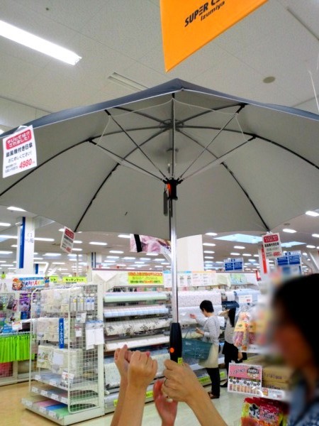 スーパーセンターイズミヤでぶらぶらしていると、扇風機が内蔵されている日傘を発見しました。