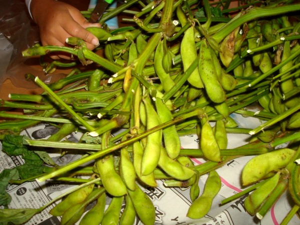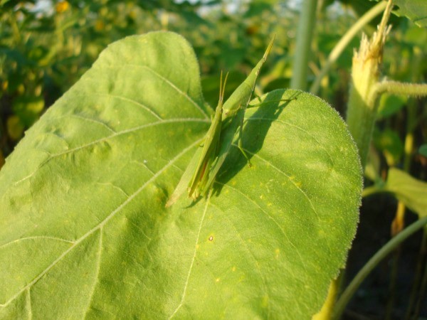 ひまわりの葉っぱに親子バッタ発見!さっちゃんがすかさず捕まえようとしていましたが、可哀想なので逃がしてやりました。