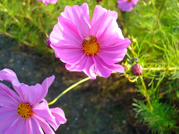 コスモスはちょうど満開になっています。でも地面は雨でぬかるんでます