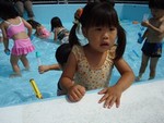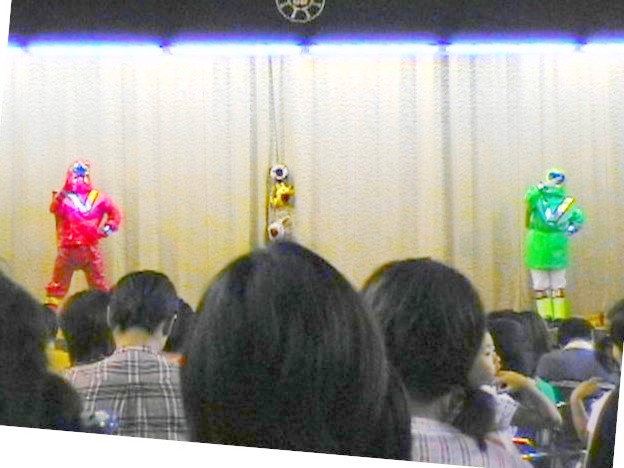 今日は、kanaの1日体験入園の日!講堂に集まって、園長先生の講義のあと、先生たちのお芝居が始まりました。最初は落ち着きのなかったkanaも2番目のお芝居が始まると、もう釘付けで見入ってました。その後は各教室で工作ものをやっているので参加しに行きましたが、プールが混みそうなので先に泳ぎにいくことに・・・・ところが、スポーツの先生を見たとたん、sachiが照れてしまってモジモジ状態!kanaをおいてすぐプールから上がってしまいます。kanaも遊び相手がいなくなって面白くないので、いっこうに遊ぼうとしません・・・・・仕方ないので、プールはやめて再び教室で工作に・・・