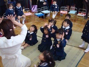 もも1組さんになったカナの担任はゆう先生で、幼稚園では人気のある先生の一人だそうです!カナよかったね。今日は机ではなく、ゴザ?の上に集まって先生のお話を聞くようです。でも大泣きする子もいて、先生に集まっている園児はまばら・・・さすが「もも組」といった感じです。ちなみにカナはど真ん中で先生の話を聞いていましたよ!(お利口さん)