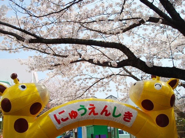 幼稚園の桜は満開です。天候も良く、最高の入園式になりました!今年は、ばら組さんも含めて約160名が入園しました。もも組さんだけでも約20名/組×7クラスで、約140名ぐらいになります。今年も大人数の園児が入園し、カナもその1人になります。