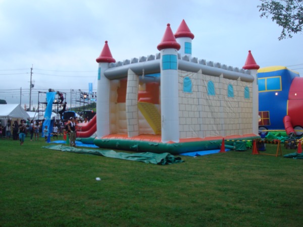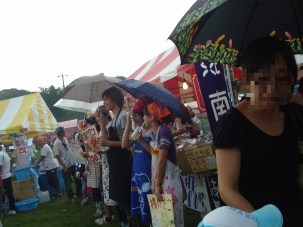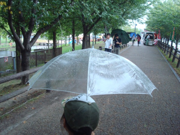 雨がポツポツ降っています。仕方なく傘をさして祭りに・・・