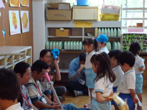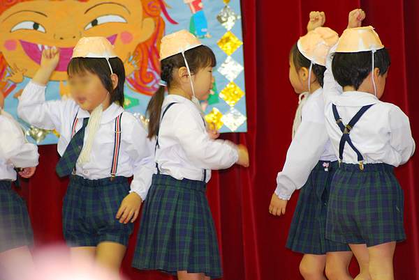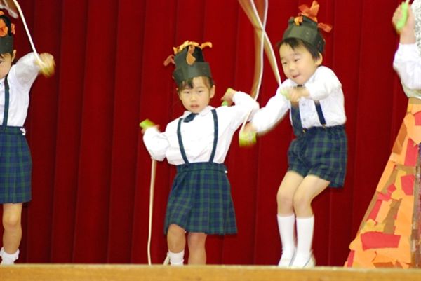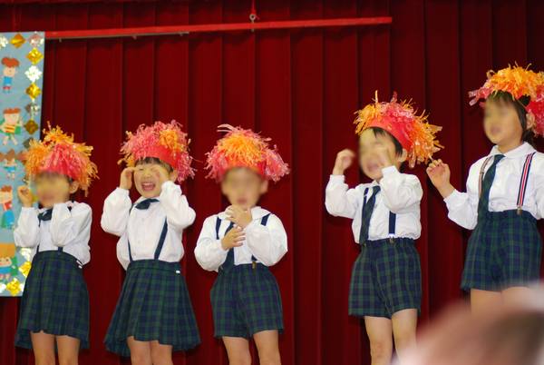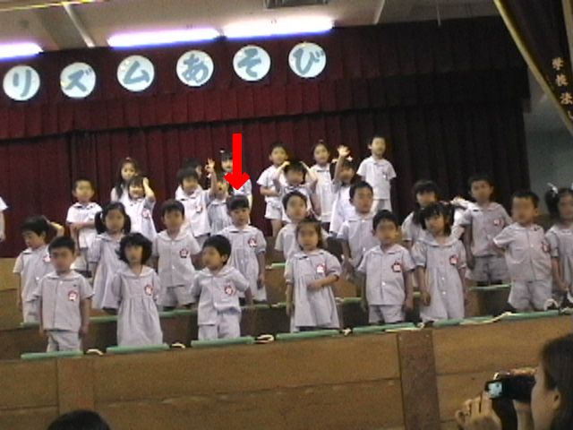 schiはプログラム8番目の登場で、司会の紹介(結構長〜い紹介)のあと、いざ始まり。なんだか隣のお友達をチラチラ見て照れながらも、歌も踊りも木琴も間違いなく?できてました。上出来です。家に帰ってビデオを見ると、また照れてまくってました。