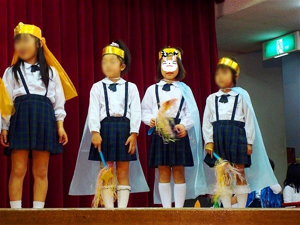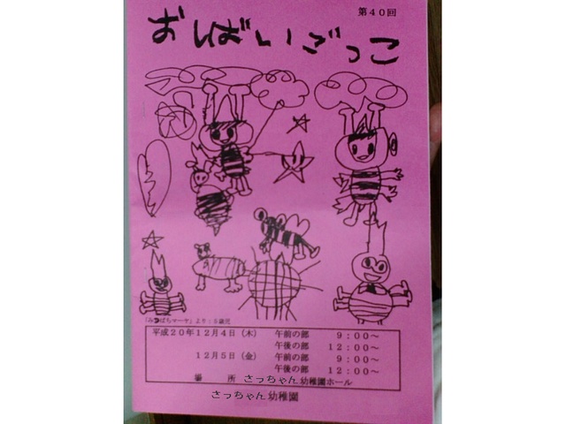 今日は、sachiの誕生日であり、「おしばいごっこ」の日でもあります。パパも会社を休んで観に来ました。sachiのお芝居は「めっきらもっきらどおんどん」というちょっと良くわからない話です。ストーリーは「遊び相手がいなくてつまらないかんたは神社ででたらめな呪文を歌います。すると木のウロに吸い込まれ、不思議な世界へ。そこに現れた三人のお化け達(もんもんびゃっこ、しっかかもっかか、おたからまんちん)とたっぷり遊んで、ゆかいなひとときを過ごします。」