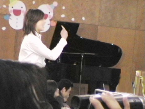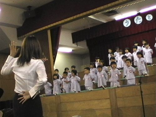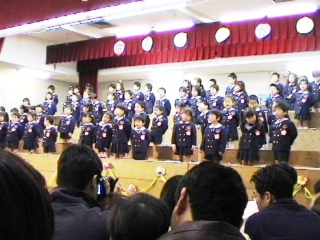 SACHI幼稚園の音楽会、見に行きました。開場時間に行ったのに、結構満員で後ろの方の座席。sachiは一番前列だったので仕方なく前の方に移動してビデオ撮影しました。年少組の合唱曲は「バナナをかぶって」と「春の花」と、最後に演奏曲が「サザエさん」でSACHIはトライアングル担当。歌の振り付けも、トライアングルも上手にできていました♪