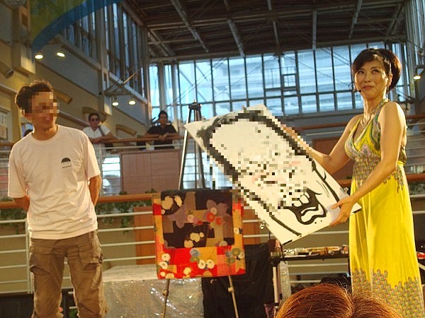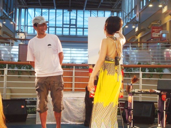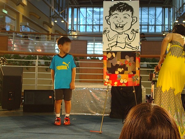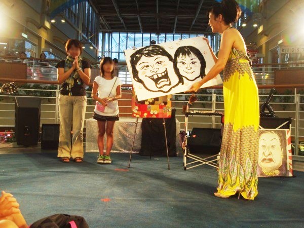 屋外のパフォーマンスもたくさんあったのですが、屋内ショーも捨てがたいので、今日は屋内だけに・・・・・・次のショーは、観客の似顔絵を毒のある解説をしながら、書き上げていきます。似顔絵も「ちょんまげ」や「虫」になったりと、やりたい放題に書かれてしまいますが、そこが面白いところでもあります!